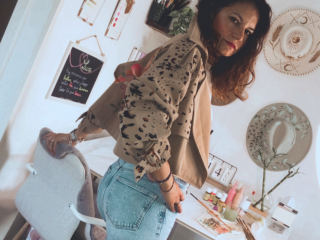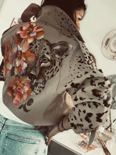 Dibujo pintado a mano artesanalmente con pinturas textiles de un jaguar y ornamentación floral, añadiendo detalles de print animal, con estampado de jaguar en la manga derecha y en la solapa derecha de la prenda.