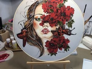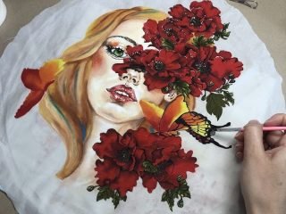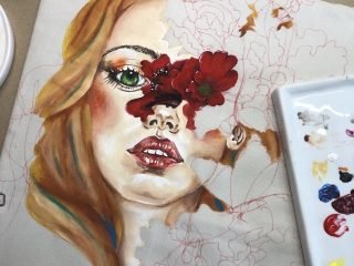 OBRA DE ARTE pintada a mano artesanalmente con pinturas textiles, de una hermosa mujer junto a ornamentación floral, una obra mística, llena de detalles.